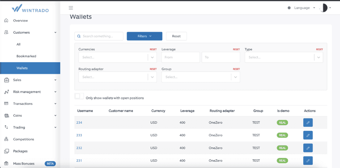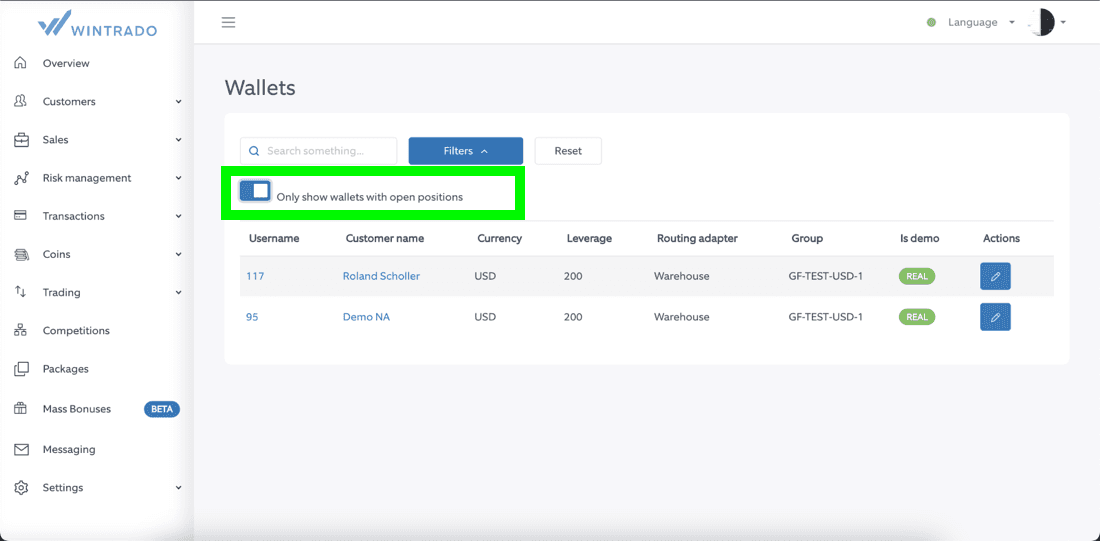 Risikomanager können jetzt von einem neuen Filter für Wallets profitieren. Dieser Filter ermöglicht es Ihnen, nur die Wallets anzeigen und überwachen zu können, die offene Positionen haben. Diese Funktion vereinfacht das Risikomanagement und bereitet die Echtzeitverfolgung von Salden und Eigenkapital in der Wallet-Ansicht vor.