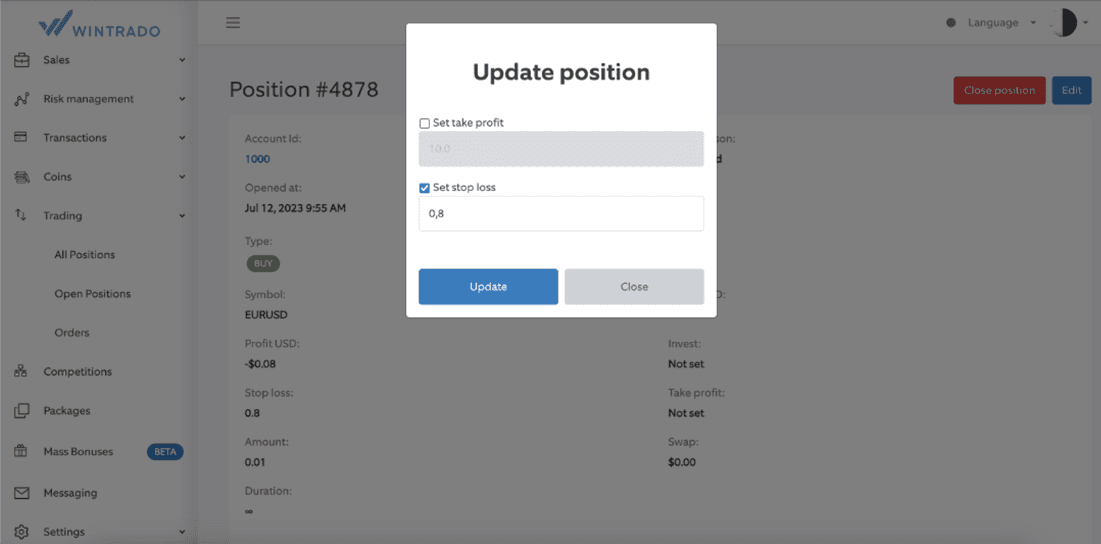 Admin-Benutzer haben jetzt die Möglichkeit, die Ausstiegsebenen (Stop-Loss / Take-Profit) und Preisniveaus (Limit / Stop-Preis) sowohl für ausstehende Aufträge als auch für offene Positionen zu ändern. Diese zusätzliche Flexibilität gibt Ihnen mehr Kontrolle über Ihre Trades und ermöglicht Anpassungen basierend auf den Marktbedingungen.