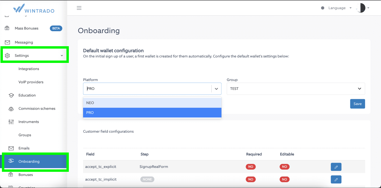 Administratoren haben jetzt die Möglichkeit, die Standardplattform und -gruppe für neue Konten zu konfigurieren. Das beinhaltet die Festlegung der Hebeleinstellungen und der Routing (A/B-Buch) Einstellungen für neue Wallets. Diese Anpassung ermöglicht einen maßgeschneiderten Onboarding-Prozess für Ihre Kunden.