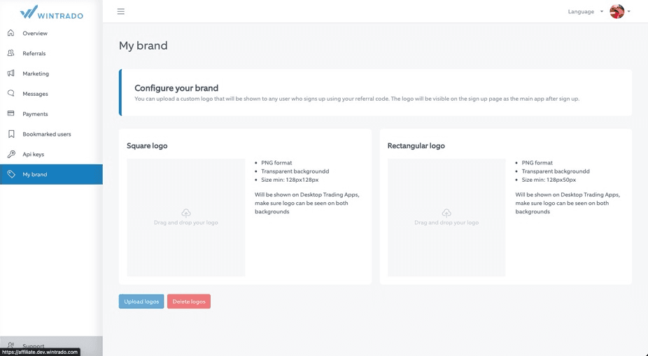 Nach der Aktivierung kann der Affiliate seine benutzerdefinierten Logos im Affiliate-Portal hochladen: