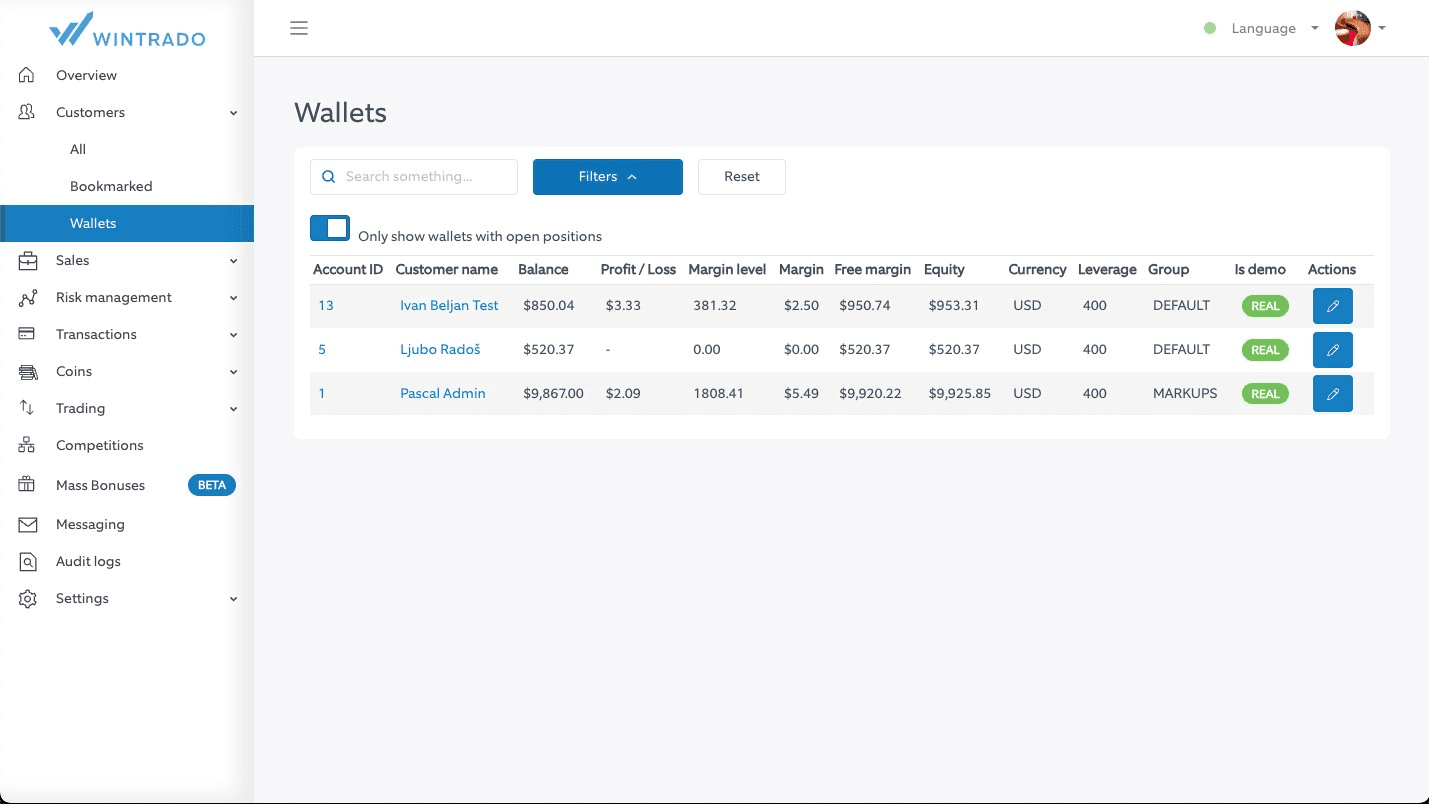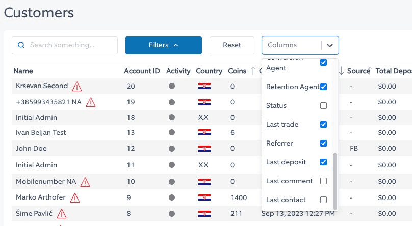 Benutzer können jetzt auswählen, welche Spalten sie in der Hauptansicht des Kunden im CRM angezeigt haben möchten. Es wurden auch einige zusätzliche Optionen hinzugefügt, wie z.B. Empfehlungsgeber, Datum der letzten Einzahlung, Datum des letzten Kommentars und Datum des letzten Kontakts.