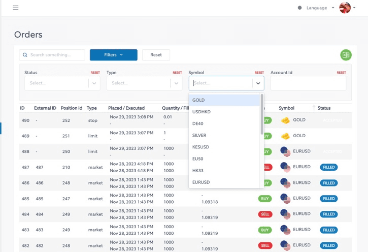 Bestellungen im Admin-Portal können jetzt nach Instrument/Symbol gefiltert werden.
