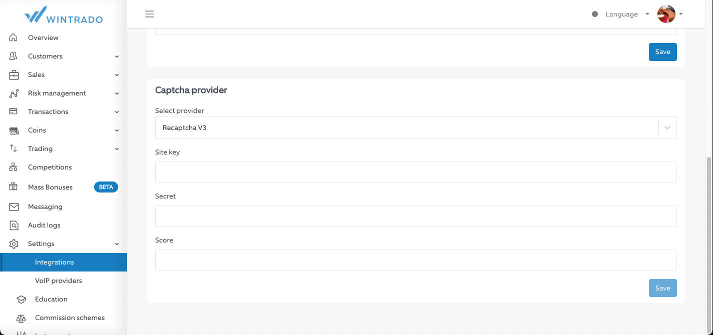 Um zu verhindern, dass Bots Konten anlegen, kann Recaptcha V3 nicht so konfiguriert werden, dass es auf der Anmeldeseite aktiv ist. Die Konfiguration erfolgt über das Admin-Portal unter Einstellungen -> Integrationen.