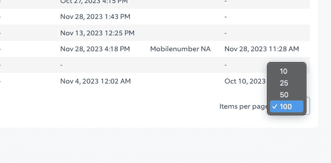 Die meisten Admin-Portal-Listen haben jetzt die Möglichkeit, die Seitengröße zu konfigurieren, d.h. wie viele Elemente angezeigt werden. Benutzer finden den Auswahlbereich in der unteren rechten Ecke der Tabellenansicht.