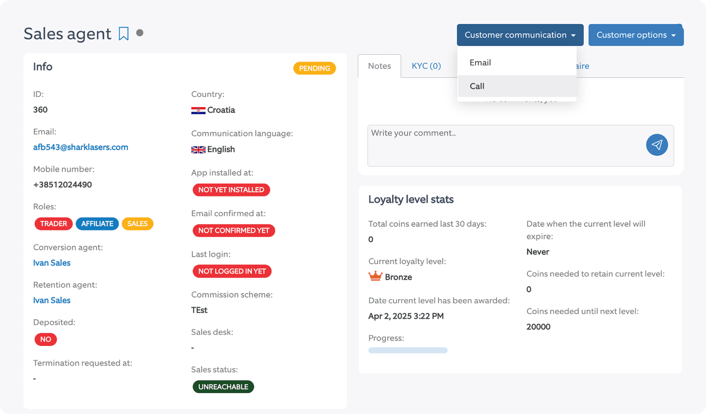 Track your sales team’s performance with key metrics like clients, deposits, and trading volume. Drill into agent profiles for detailed user data and communication history to spot top performers and refine your strategy.