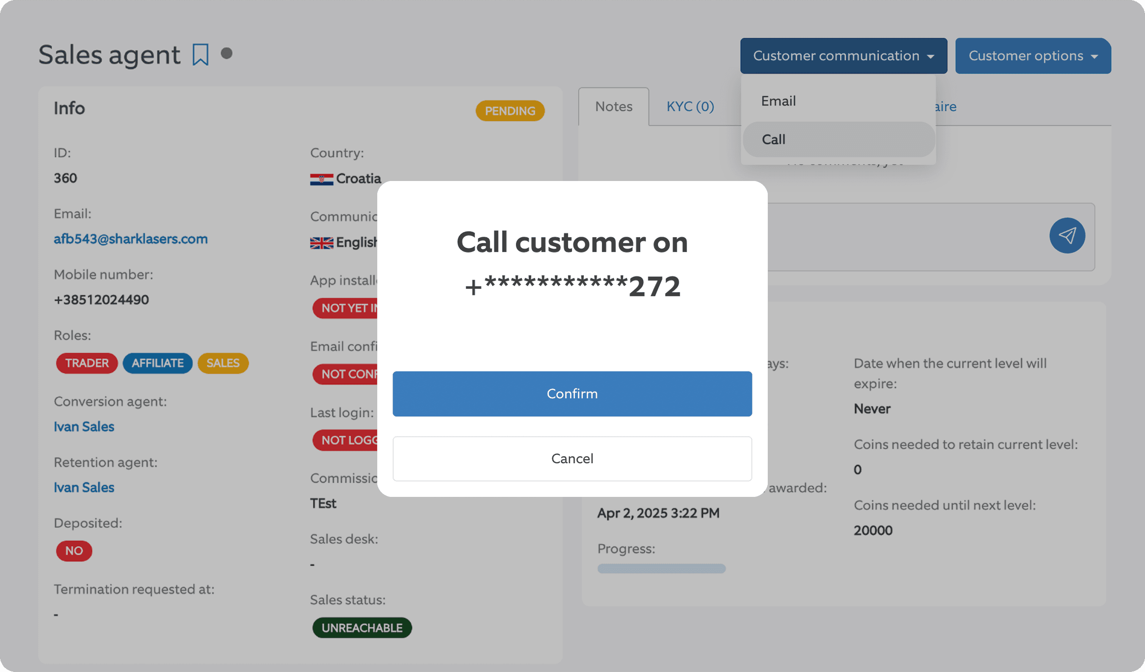 Enable instant click-to-call from the admin portal with seamless VoIP integration (Coperato, Voiso, VoiceSpin). Protect customer privacy with data masking and control agent access to contact details.